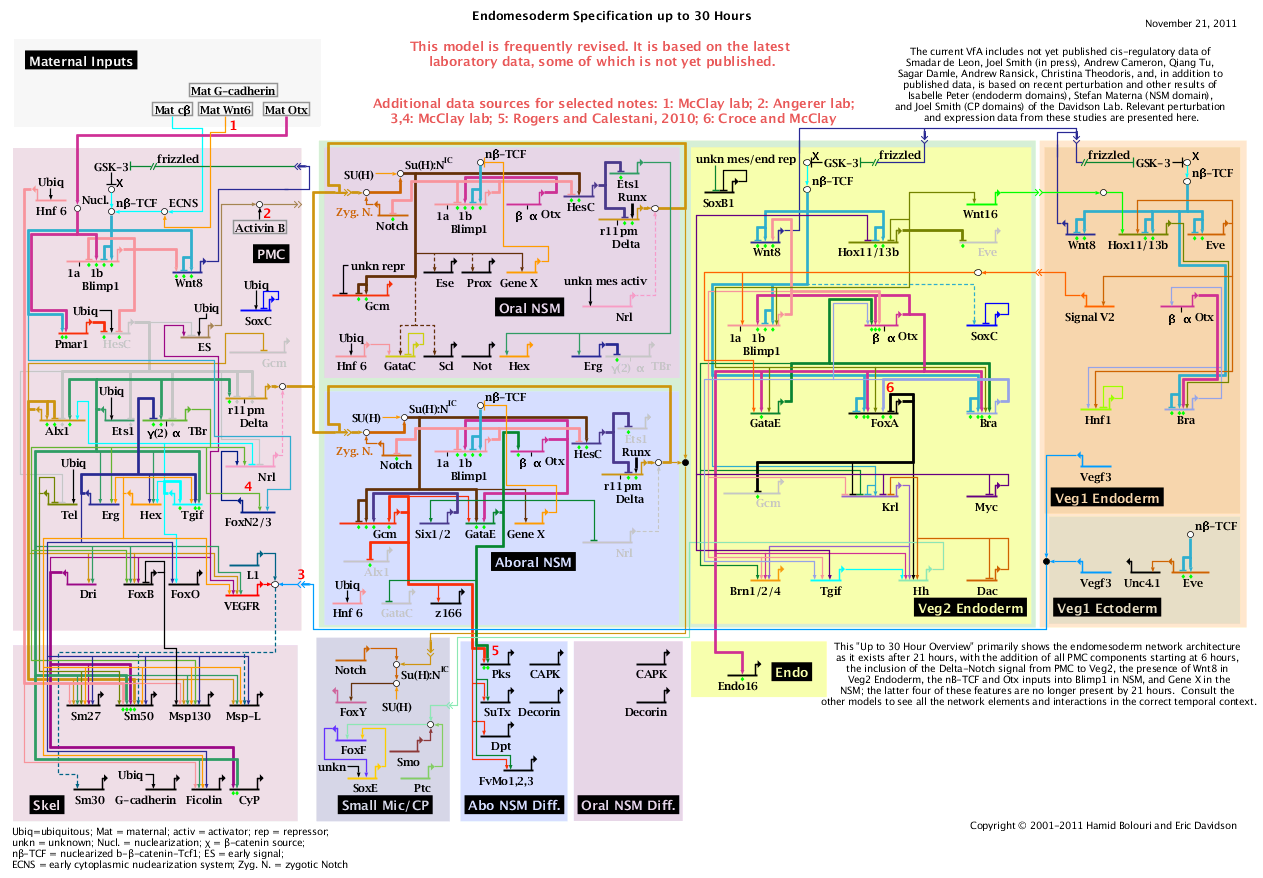 Fig. 3.3. Overview of the developmental gene regulatory network (dGRN) for the construction of a tissue called the endomesoderm in sea urchins, concentrating on the network after 21 hours. The diagram strongly resembles a complex electrical or computer-logic circuit. (http://sugp.caltech.edu/endomes)