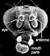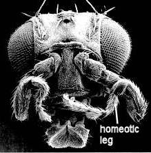 | Fig. 3.4. Above: A normal specimen of the fruit fly Drosophila (top), and a mutant fly in which the third thoracic segment has been transformed so that it duplicates the second thoracic segment. Below: On the left, the head of a normal fruit fly; on the right, the head of a mutant fly in which the antennae are transformed into legs.3 |