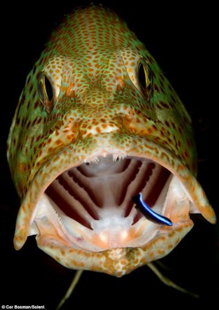 Fig. 3.2. A bluestreak cleaner wrasse in the mouth of a grouper.