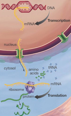 Fig. 2.2. Highly simplified diagram of protein synthesis (or gene expression). During transcription, the sequence of nucleobases on a strand of DNA is reproduced on a molecule called messenger RNA (mRNA) by an enzyme known as RNA polymerase. Next, mRNA migrates from the cell nucleus to a structure called a ribosome in the cytoplasm, where a process known as translation takes place. With the help of transfer RNAs (tRNAs) and specific enzymes, a chain of amino acids is built up, with each amino acid being specified by a three-nucleotide sequence (a codon) on the mRNA. The amino-acid chains then fold into functional proteins. The full complexity of protein synthesis is staggering (see animation).