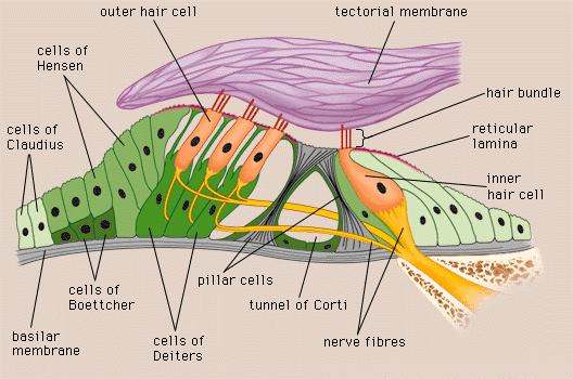 Fig. 7.1. The organ of Corti contains rows of sensory hair cells, which generate nerve impulses in response to sound vibrations.3