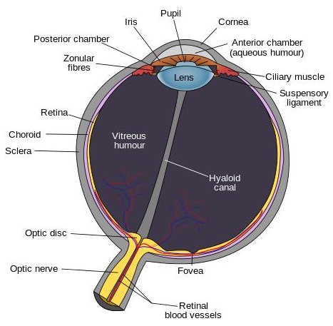 Fig. 7.5. Cross-section of the human eye. The retina has 130 million light-sensitive rods and cones, which cause photochemical reactions that transform light into electrical impulses. About a billion impulses are transmitted to the brain every second, by means that are poorly understood.
