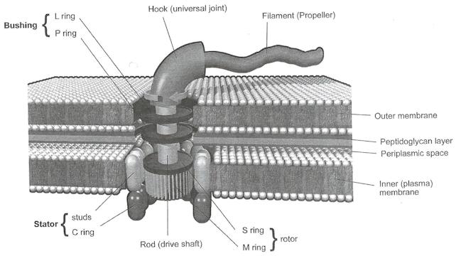 Another irreducibly complex system is the rotatory flagellum – a sort of outboard motor that some bacteria use to swim. Some flagella turn at more than 1000 revolutions per second. The device includes a long tail that acts as a propeller; the hook region, which attaches the propeller to the drive shaft; the motor, which uses a flow of acid from outside the bacterium to the inside to power the turning; a stator, which keeps the structure stationary in the plane of the membrane while the propeller turns; and bushing material to allow the drive shaft to poke up through the bacterial membrane. In the absence of the hook, the motor, the propeller, the drive shaft, or most of the 40 types of proteins necessary for the construction and operation of the flagellum, either no flagellum is produced or one that does not work at all.1