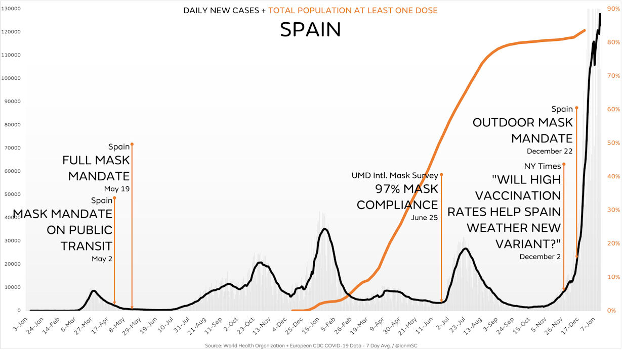 Gibraltar vaccinated nearly its entire population of 34,000 people (plus many tourists). After the start of vaccination in December 2020, cases rose from 1040 to 7092 and deaths attributed to Covid rose from 5 to 98 – a mortality rate of 2878 per million, the highest in Western Europe. Having dutifully followed ‘The Science’, Gibraltar then cancelled Christmas. (ianmSC)