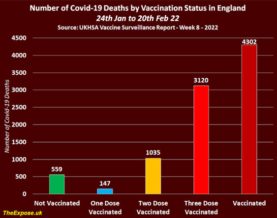 From 24 Jan. to 20 Feb. 2022, vaccinated people accounted for 88.5% of all Covid deaths in England. (dailyexpose.uk)
