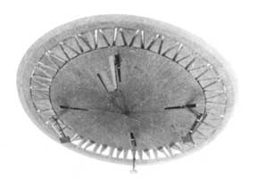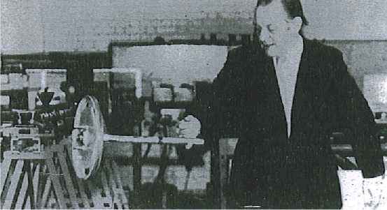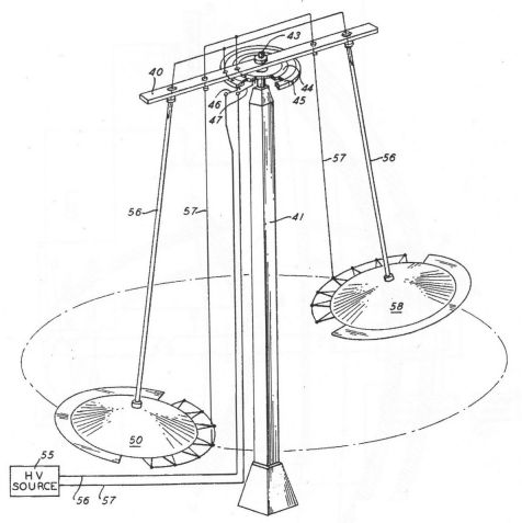 In 1952 an Air Force major general witnessed a demonstration in which Brown flew a pair of 18-inch disc airfoils suspended from opposite ends of a rotatable arm (fig. 2.2). When electrified with 50,000 volts, they circuited at a speed of 12 miles per hour. Later that year, however, an investigator from the Office of Naval Research wrote a report which concluded that the discs were propelled by the pressure of negative ions striking the positive electrode (ion wind), rather than by modifying gravity. Around 1953 or 1954, Brown staged a demonstration at Pearl Harbor for a number of admirals, using 3-foot-diameter discs. Paul LaViolette writes: