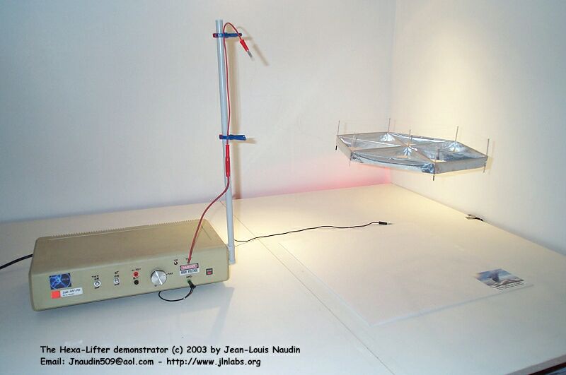 The B-B effect is said to be demonstrated by cheap, lightweight devices known as ‘lifters’, made of aluminium foil, balsa wood and thin wire, and powered by a ground-based high-voltage power supply.14 Hundreds of independent researchers around the world have experimented with these devices. The lower and larger electrode is a strip of aluminium foil stretched between balsa wood struts. The smaller electrode is a thin strip of wire mounted about one inch above the aluminium foil. When a 30,000 volt charge is applied, a hissing noise is heard and the lifter rises into the air as far as its tether will reach. A thrust also occurs when the lifter is oriented horizontally, showing that the effect does not involve gravity shielding. The lifter works regardless of whether the positive or negative terminal is connected to the wire (the leading electrode), though the thrust is slightly larger if a positive voltage is applied.