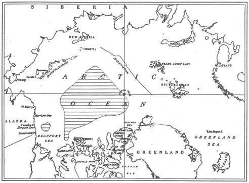 Another famous disappearing land is Crocker Land, ‘discovered’ by Peary. He first saw it on 24 June 1906 from the top of a 2000-ft mountain situated behind Cape Colgate in northern Greenland. He wrote: ‘North stretched the well-known ragged surface of the polar pack, and northwest it was with a thrill that my glasses revealed the faint white summits of a distant land which my Eskimos claimed to have seen as we came along from the last camp.’ A few days later, on 28 June, Peary was at Cape Thomas Hubbard at the northern tip of Axel Heiberg Island. It was a clear day and, from the top of a 1600-ft hill, Peary says that through his binoculars he was able to ‘make out apparently a little more distinctly, the snow-clad summits of the distant land in the northwest, above the ice horizon’. At both locations Peary built cairns in which he left a brief record.
