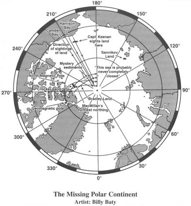 Lamprecht believes that Cook’s photo of Bradley Land may also be a telescopic mirage, probably of the easternmost extension of Crocker Land, which he thinks is located on the earth’s outer surface, but is being covered up because it lies too close to the polar hole. He thinks that Keenan Land could also be a telescopic mirage of the same gigantic polar continent (seen at a distance of over 900 miles!), but that this is probably not true of Sannikov Land given the direction in which it was sighted. He believes that Sannikov Land may lie further away than was originally thought and that the Russians may be keeping it under wraps because it lies too close to the polar hole (though this is difficult to understand from his map – see below).3