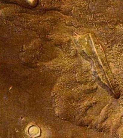 In the original Viking image, the Fort (or Fortress) appears to consist of three straight sides enclosing a triangular courtyard. In the MGS image taken in 2000, the Fort, illuminated from the south, loses its geometrical appearance and looks highly eroded; the courtyard is seen to be part of the structure’s elevated platform. The three straight edges are still there, but not as obvious because of the lighting geometry. There is a trench or pathway of some kind radiating from the eastern side.