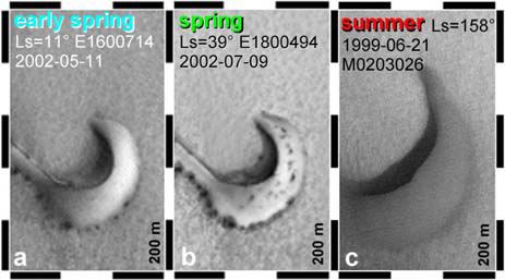 In the polar regions of Mars there are mysterious dark spots, fan-like markings, and spider-shaped features, ranging in size from tens to hundreds of metres, which show seasonal changes in shape, size and colour. Some dark patches disappear over winter but reappear in the same places in the spring.