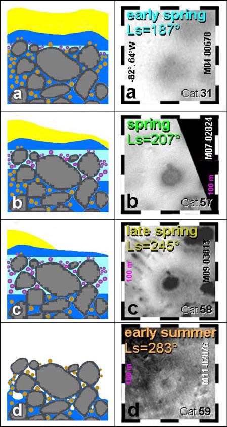 Features like those in the left-hand image (M0804688) are widely believed to be caused by jets of carbon dioxide gas erupting from the ice cap as it warms in the spring; dark sand and dust are carried aloft and then fall back to the surface. Dark spots, typically 15 to 46 m wide, appear first, followed by fan-shaped dark markings, which may grow to half a mile in length. The dark patches disappear in winter, when a layer of CO2 ice about a metre thick covers the thin layer of dark sand and dust lying on a permanent ice cap of water ice. In spring, the cycle begins again: sunlight warms the dark material, the ice touching it sublimates, and trapped gas eventually breaks through the CO2 slab at weak spots that become vents. As high-pressure gas rushes towards the vents it snatches up particles of sand and carves the spidery network of grooves (jpl.nasa.gov).