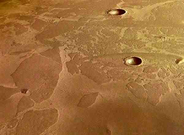 In Elysium Planitia, a large volcanic region near the equator, an area measuring about 800 by 900 km is believed by some scientists to consist of frozen water ice covered by a layer of volcanic ash some 45 m thick. This interpretation is based on the flat plates, fracture patterns, and curved rims of impact craters (typical of craters that form in ice). In one locality, the ice is at or very near the surface and is regarded as pack ice. The former sea is believed to have frozen quickly, perhaps as recently as 2 to 5 million years ago. (newscientist.com; marsdaily.com; rst.gsfc.nasa.gov).
