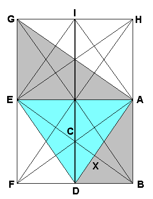 Focusing on the five mounds G, E, A, D, and B, the four right-angled triangles GEA, BAE, GAD, and ADB all have the same angles. Triangles GEB and GAB are congruent (i.e. have the same shape and size). Isosceles triangle ADE is the double of the triangle ADB. Note that if the distance DB = 1 unit, then EA = 2 units, and GD = 3 units. Also, if the area of ADB = 1 unit of area, then the areas of both GEA and BAE = 2 units, the area of GAD = 3 units, and the area of the pentad GABDE = 5 units. The obtuse triangles GED and EDB also have areas of 1 unit. These five mounds are at 5 of the 8 nodal points of a special rectangle called the √2 rectangle (if AB = 1, AE = √2), which is closely related to the geometry of a tetrahedron (a regular polyhedron having four triangular faces).