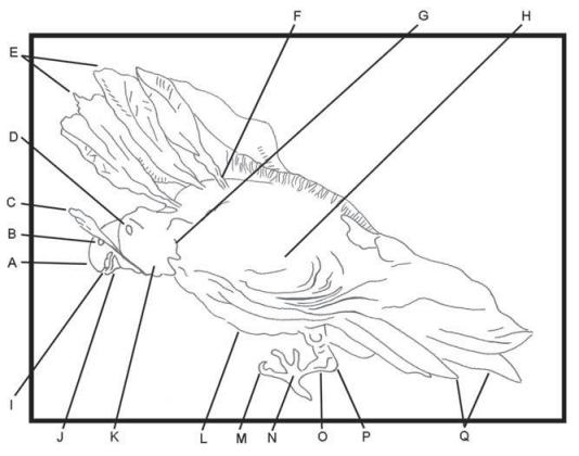 Avian-looking formation on the northwest rim of the Argyre Basin (48.0°S, 55.1°W). Top: A portion of MGS image S1301480, with the avian feature at the bottom. Bottom: Anatomical features: A) beak; B) cere; C) crest; D) eye; E) primary flight feathers (right wing); F) feather shafts; G) hood line (neck); H) body (folded left wing); I) tongue; J) jaw; K) head; L) abdomen; M) claw; N) foot and toes; O) tarsus joint; P) tibia; Q) tail feathers. The formation is about 2.4 km long from the tip of its ‘beak’ to the tip of its farthest ‘tail feather’ (Dale et al., 2011; metaresearch.org; metaresearch.org).
