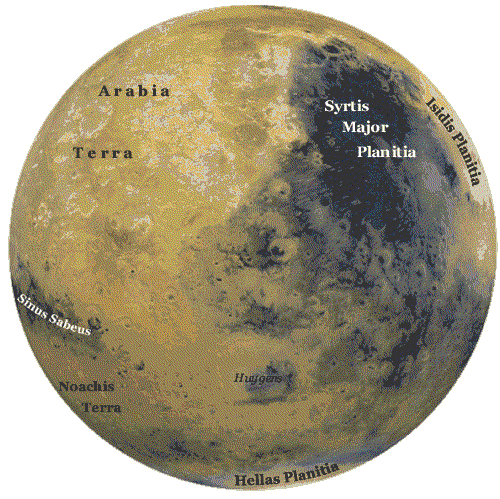 • Hesperian, 3.8-3.5 to 3.5-1.8 billion years ago: slower rate of meteorite bombardment, formation of extensive lava plains, huge amounts of flowing water, especially in the north, where there may have been an ocean.