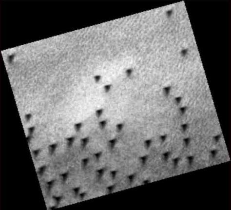 Arranged triangles (M0102950). Van Flandern: ‘While these triangles might be shadows, the arrangement of so many nearly identical objects in lines and along concentric arcs of circles compels our attention.’ (metaresearch.org)