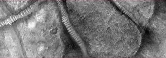 Numerous images show ribbed patterns such as these. Some researchers, such as Richard Hoagland (enterprisemission.com) and Tom Van Flandern (metaresearch.org), think they might be glass tubes or tunnel systems. Most scientists believe they are dunes. Mark Carlotto (2008, 134) writes: ‘Nestled inside narrow winding valleys, perhaps they are the fluvial remains of ancient streambeds ...’