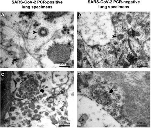 These electron-microscope images show similar ‘virus’-like particles in specimens from