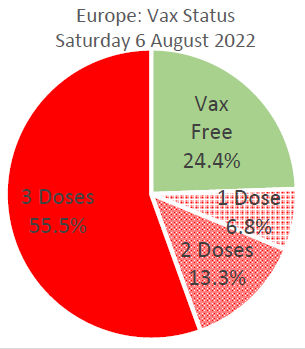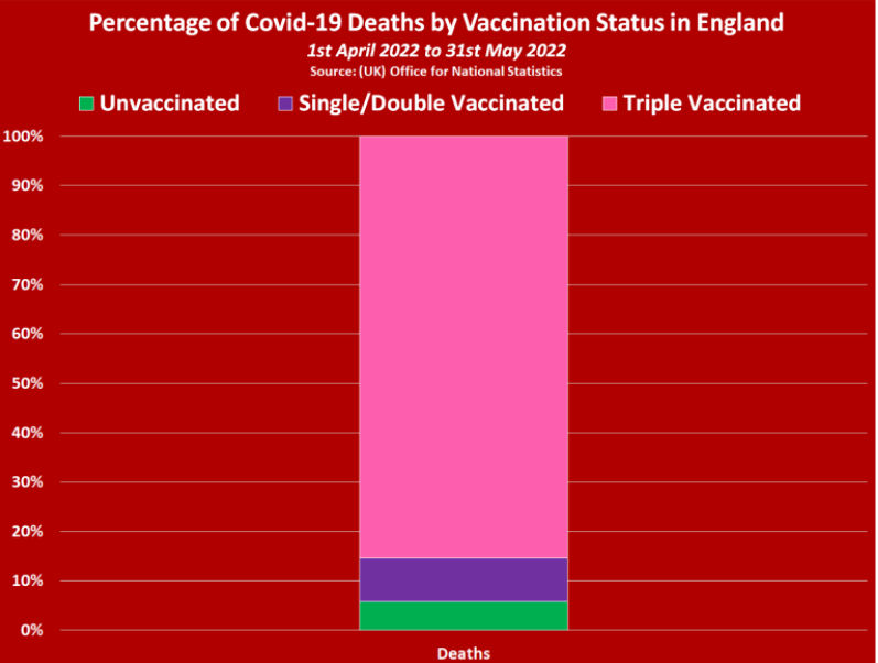 As of 1 July 2022, there were 459,261 reports of adverse events and 2207 reported deaths from Covid vaccines in the United Kingdom. In April/May 2022, vaccinated people accounted for 94% of all Covid deaths in England, and 90% of them were triple/quadruple jabbed. Almost 20% of adults in England had not had a single dose of the vaccine and almost 40% had not had three doses.