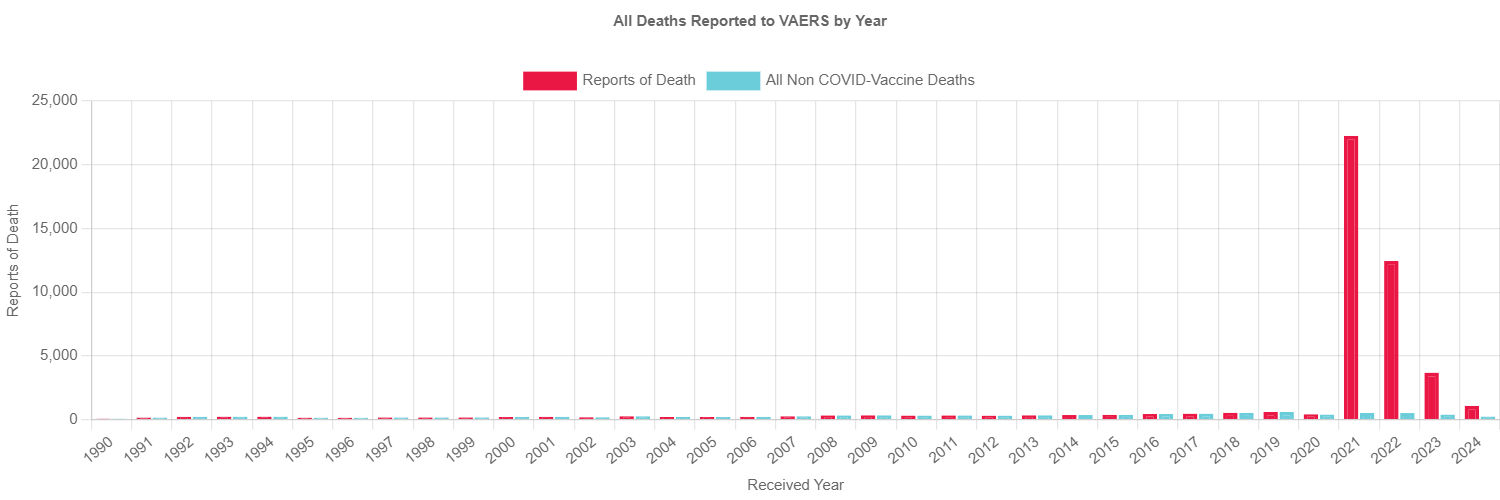 The US Vaccine Adverse Event Reporting System (VAERS) shows that Covid vaccines have caused more injuries and deaths than all other vaccines combined over the past 30 years. As of 2 August 2024, there had been 1,644,248 reports of adverse events and 37,814 reported deaths from Covid vaccines in the United States. However, most adverse events are not reported at all, and the real total is estimated to be about 40 times higher than the number reported. Autopsies reveal that between 30% and 93% of deaths attributed to Covid vaccines are actually caused by the vaccines.