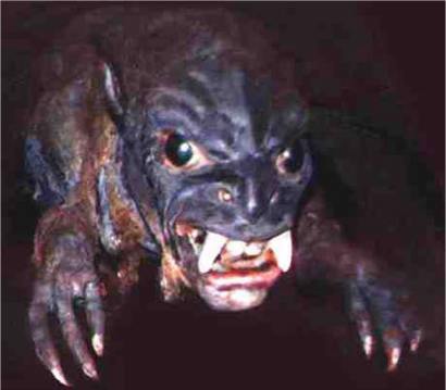 The chupacabra (Spanish for ‘goat-sucker’) is said to feed on the flesh or blood of domesticated animals. It has been described as about 4 feet tall, covered with short, fine grey fur with spots, with a set of spines running down its back. It has dark, protruding eyes, a slit-like mouth, long, skinny legs with only three toes, long, skinny arms and hands, and three long, skinny fingers that end with claws. In some descriptions, the chupacabra has scales and/or bat-like wings. The creature hunts at night, attacking goats, horses, dogs and cats. In many cases, two small holes were reported in the neck of the dead animal and all the blood had been drained. No human deaths have so far been attributed to a chupacabra, but there are reports of individuals being threatened.