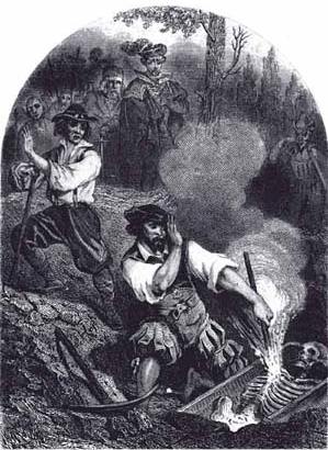 Later, the young widow and her former lover were again betrothed. On the night of the betrothal feast, after everyone had gone to bed, her deceased husband suddenly entered her room, looking extremely pallid, rebuked her for her inconstancy, and beat and pinched her, leaving black and blue marks on her body. He also left her bleeding from a slight puncture on her neck. The next morning, the guard stationed at the bridge spanning the river reported that, just before midnight, a black coach and six horses had sped past toward the town, without answering his challenge.